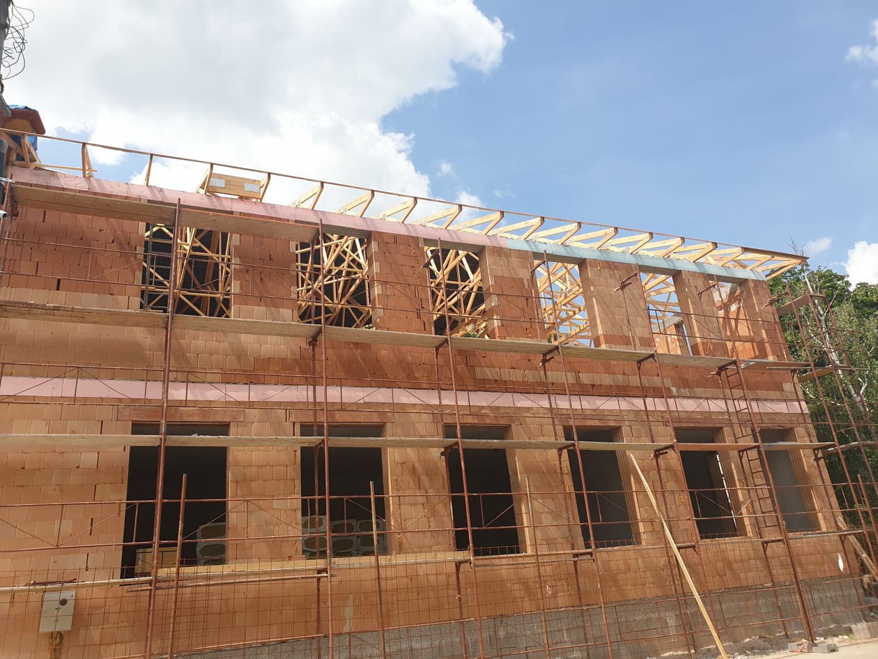 osztályok és az óvoda méretét csak hozzáépítéssel tudtuk megoldani. A meglévő épületrészhez harmonikusan illeszkedő kétszintes épületbővítés